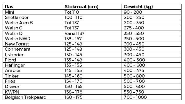 In sommige situaties kan het handig zijn om het gewicht van je paard te weten. Bijvoorbeeld wanneer je een supplement wilt voeren of wanneer je moet rantsoeneren omdat je paard aanleg heeft om te dik te worden, maar ook wanneer hij een wormkuur nodig heeft. De nauwkeurigste manier is natuurlijk het paard wegen, maar een dergelijke weegschaal is vaak niet voor handen. Dus moet je een zo nauwkeurig mogelijke schatting maken. Onderstaande tabellen geven een indicatie wat het gewicht ongeveer zal zijn, maar dit is wel een vrij ruwe schatting. Het gewicht bepalen op basis van alleen het ras of alleen stokmaat is erg lastig, omdat hierbij geen rekening wordt gehouden met conditie en type. Ook kan er binnen een ras veel variatie zijn.