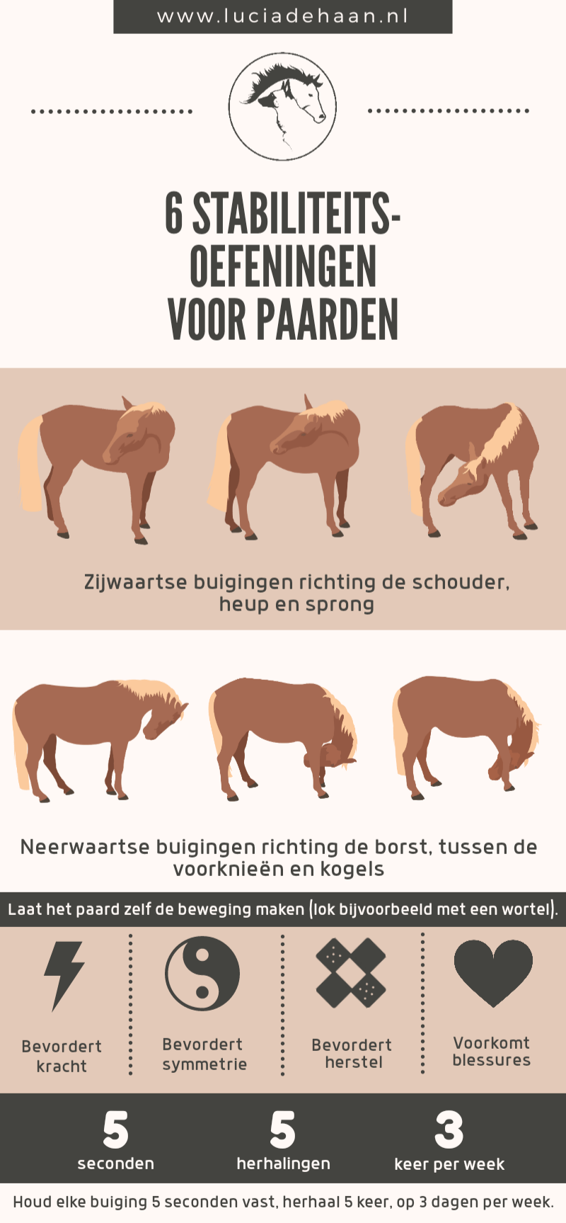 Bij al deze oefeningen is het de bedoeling dat je paard zelf de bewegingen maakt. Het handigste is om hem met iets lekkers in de gewenste richting lokken met zijn hoofd. Ga daarbij niet over zijn grenzen; als hij niet bij zijn heup kan komen laat je hem gewoon iets minder ver buigen en probeer je dit langzaam op te bouwen. De oefeningen bestaan uit een dynamisch en een statisch deel, oftewel een bewegend en een stilstaand deel. Je paard moet dus in de gewenste richting bewegen en daarna de houding even vasthouden, zo’n vijf seconden is voldoende.