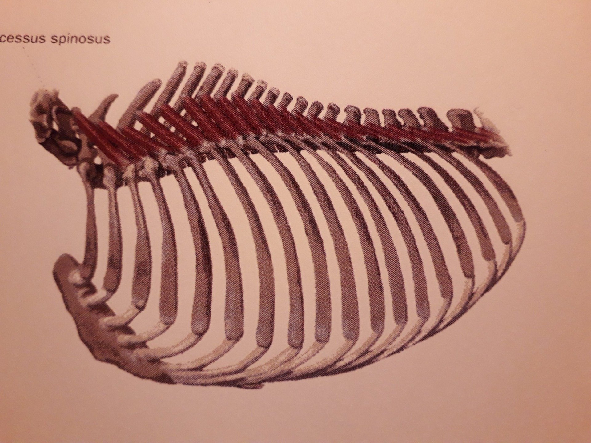 Een belangrijke houdingsspier is de m. multifidus (of mm. multifidi). Deze bestaat uit vele spierbundels die dicht langs de thoracale en lumbale wervelkolom liggen, en van de zijkant van de wervel naar het doornuitsteeksel van een voorgelegen wervel lopen (simpel gezegd). Ze vangen de krachten op de wervels op om ze op hun plek te houden. Hierdoor spelen ze een belangrijke rol in de rompstabiliteit. Uit onderzoek bij mensen is gebleken dat deze spier erg snel in volume kan afnemen in reactie op pijn. Na drie dagen werd er al een significante afname gemeten op de plek waar de pijn zich bevond. Hierdoor ontstaat lokaal een instabiliteit van de wervelkolom en asymmetrie tussen de linker en rechter multifidus. Ook wanneer de pijn weggenomen was, bleef de atrofie aanhouden, tenzij de spier door middel van oefeningen weer geactiveerd werd. Dit voorkwam ook het terugkeren van de rugpijn. Bij paarden blijkt dit ook zo te werken.